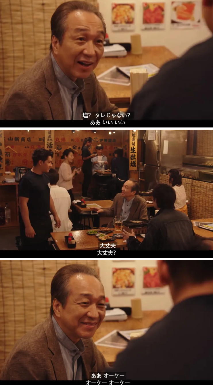 场景切换。主角与他的前辈相约在居酒屋一叙,在他们开始聊天之前一位在店内打工的外国留学生端来了烤串,但却不小心搞错了:
